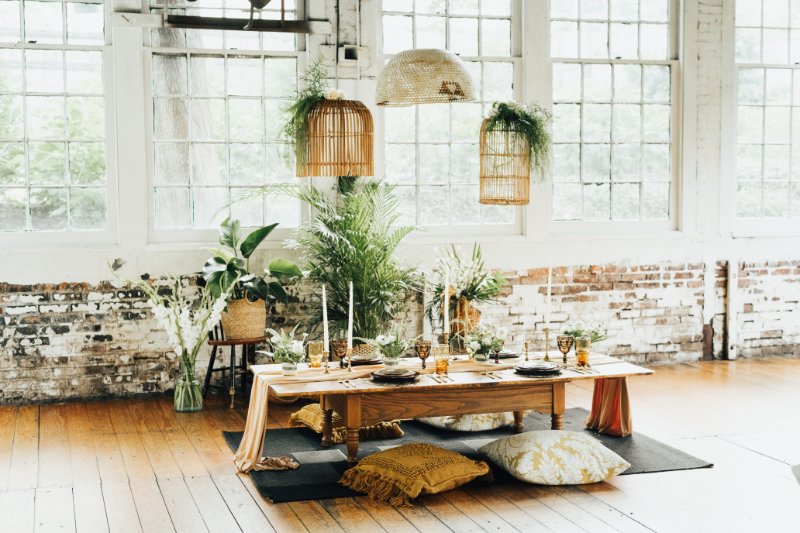 The pandemic encouraged tons of people across the world to become plant moms and we thought it would be fun to create a jungle of plants with a ‘bring your own plant’ styled shoot. So, all the vendors brought one of their favorite plants and we created a wilderness of plants. We wanted to showcase stunning muted flowers mixed with healthy, lucious plants that bring happiness along with tons of boho texture with pillows, blankets, furniture and accessories!