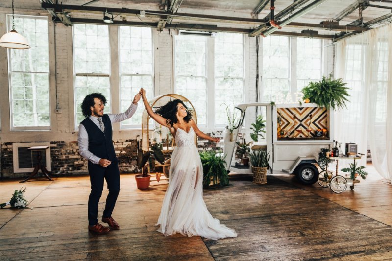 Shannon’s light and film-esque photography style was the perfect pair for this shoot and she perfectly captured every detail including the tablescape with hanging baskets and a floral installation, a ceremony filled with plants and a backdrop of the Lace Factory which is a stunning venue that was once a factory that produced lace that showcases original hardwood floors, floor to ceiling windows and industrial ceiling.
