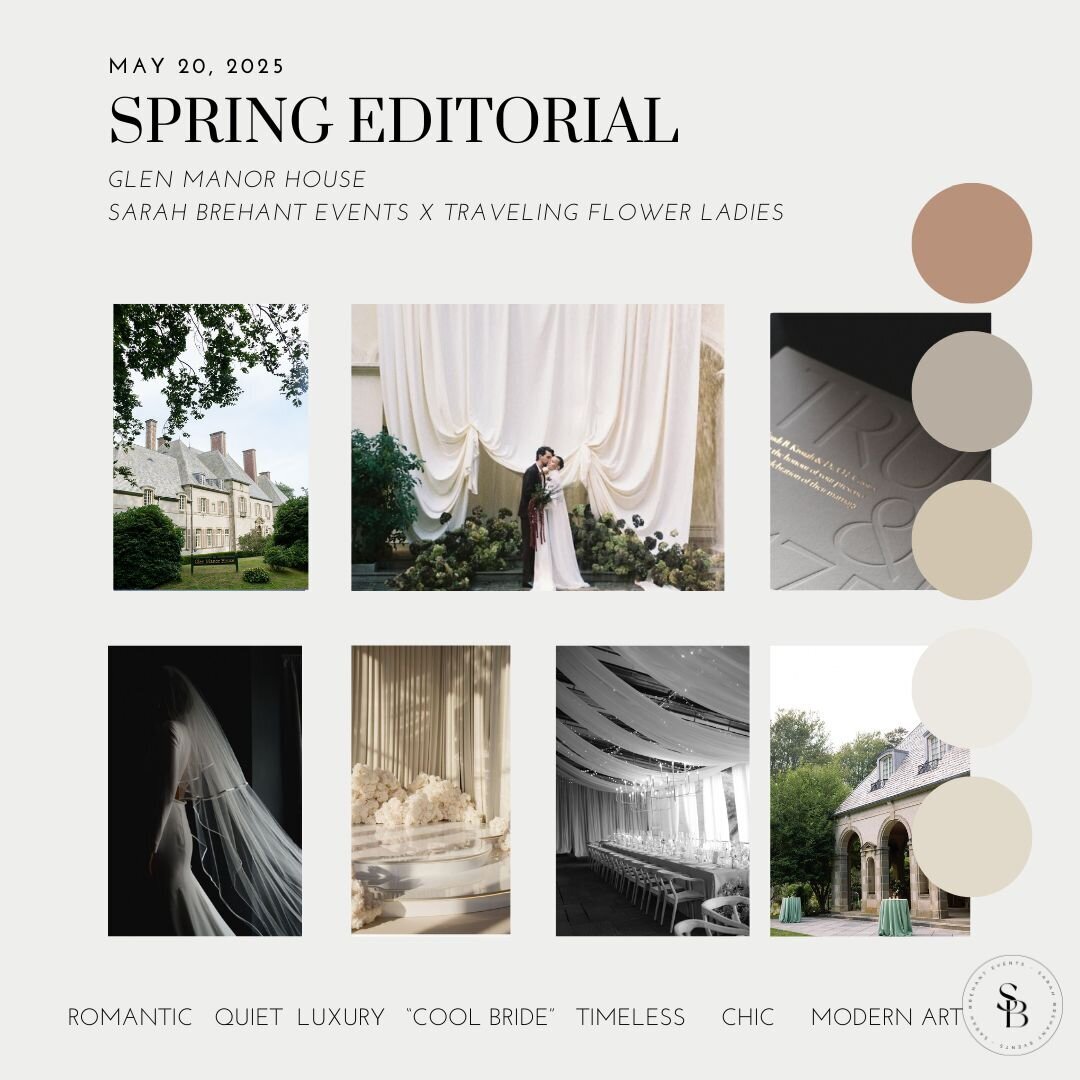 A romantic and timeless Spring wedding editorial hosted at Glen Manor House in Newport, Rhode Island. With details that exuded quiet luxury, this wedding maximized the design and aesthetic of Glen Manor House and showcased the French chateau inspired venue it in a new light. Featuring organic florals designed by Traveling Flower Ladies, the modern color palette was inspired by the Pantone color of the year, Mocha, With a mix of green and brown velvet + boucle chairs, moody candlight, and unique wedding lighting this editorial was perfect for the chic bride.